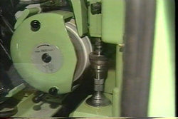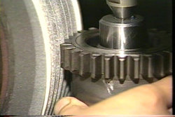歯車と砥石を噛み合わせ、加工します。